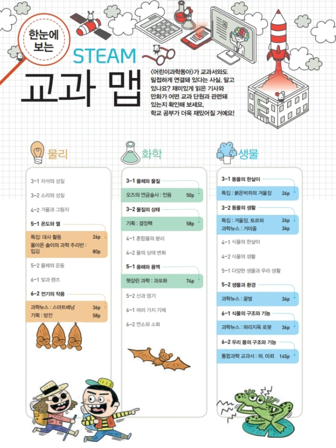 과학계 이슈를 어린이의 눈높이에 맞춘 <특집>과 <기획>, 다양한 주제로 재밌게 과학을 배우는 <과학만화>, 초등학생을 위한 <통합과학 교과서>, 초등 전 학년 교과과정과 연계된 <교과 맵>