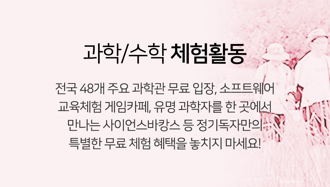 동아사이언스에서 엄선한 과학 체험 프로그램을 무료 또는할인 혜택과 함께 즐길 수 있어요.단, 혜택을 받으려면 정기구독 인증은 필수! 동아사이언스닷컴온라인 회원 가입 후 정기구독 인증을 받으세요!